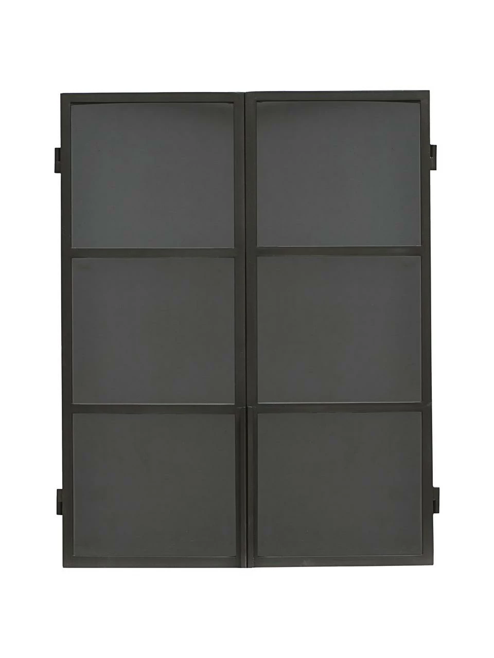 La vitrine dispose de deux portes en verre avec poignées et de trois étagères non réglables en hauteur.
