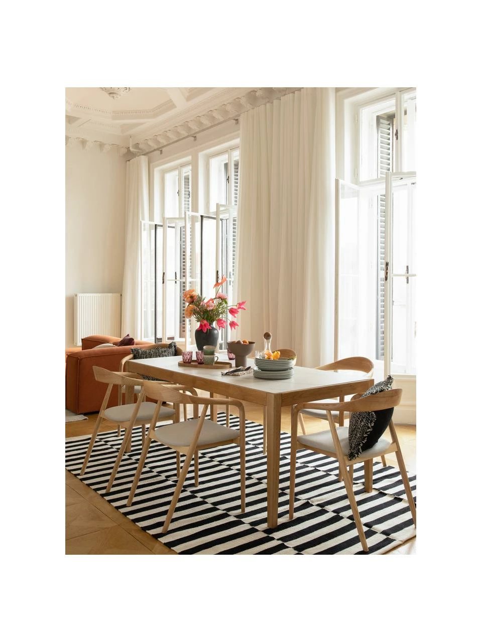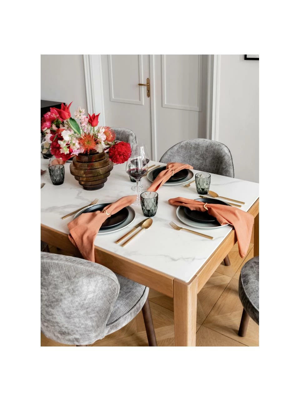 La table en bois classique est maintenant améliorée par nos soins grâce à un plateau en céramique à l’aspect marbré. Cela transforme la table classique en chêne et s’accorde avec tous les styles. Qu’est-ce qui nous plaît particulièrement ? Elle offre de la place pour six personnes, c’est-à-dire suffisamment de places assises pour la famille et les amis.